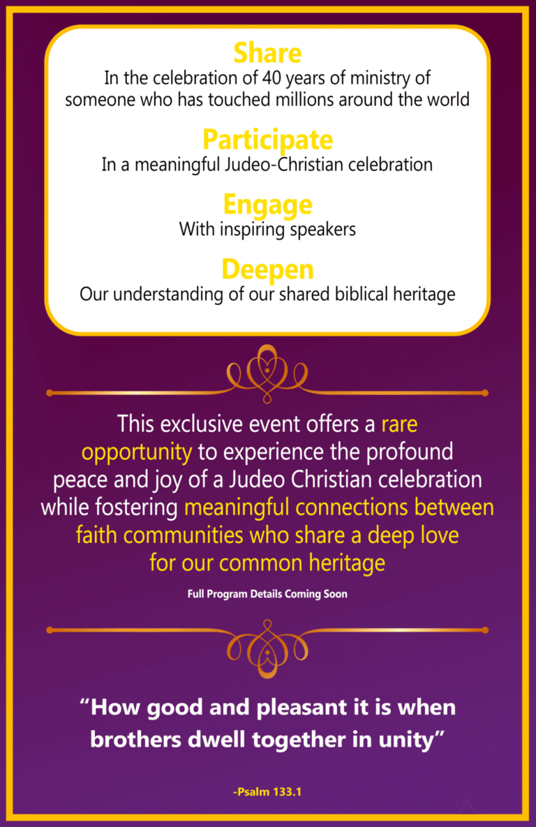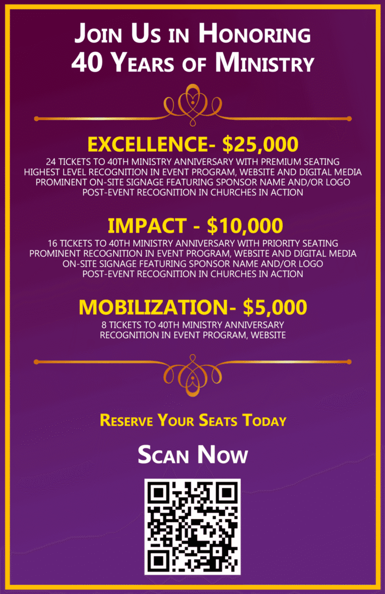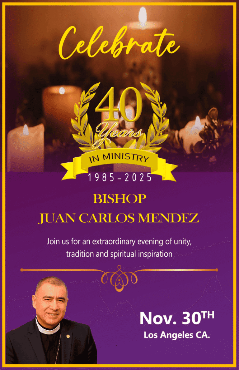 Join us on November 30th in Los Angeles, CA, for a heartfelt celebration honoring Bishop Juan Carlos Mendez's remarkable 40 years in ministry (1985-2025)! This extraordinary evening promises unity, tradition, spiritual inspiration, dinner, and entertainment—creating a wonderful night of lasting memories for our great friend and all who attend. Come be part of this special tribute; we'd love to see you there!